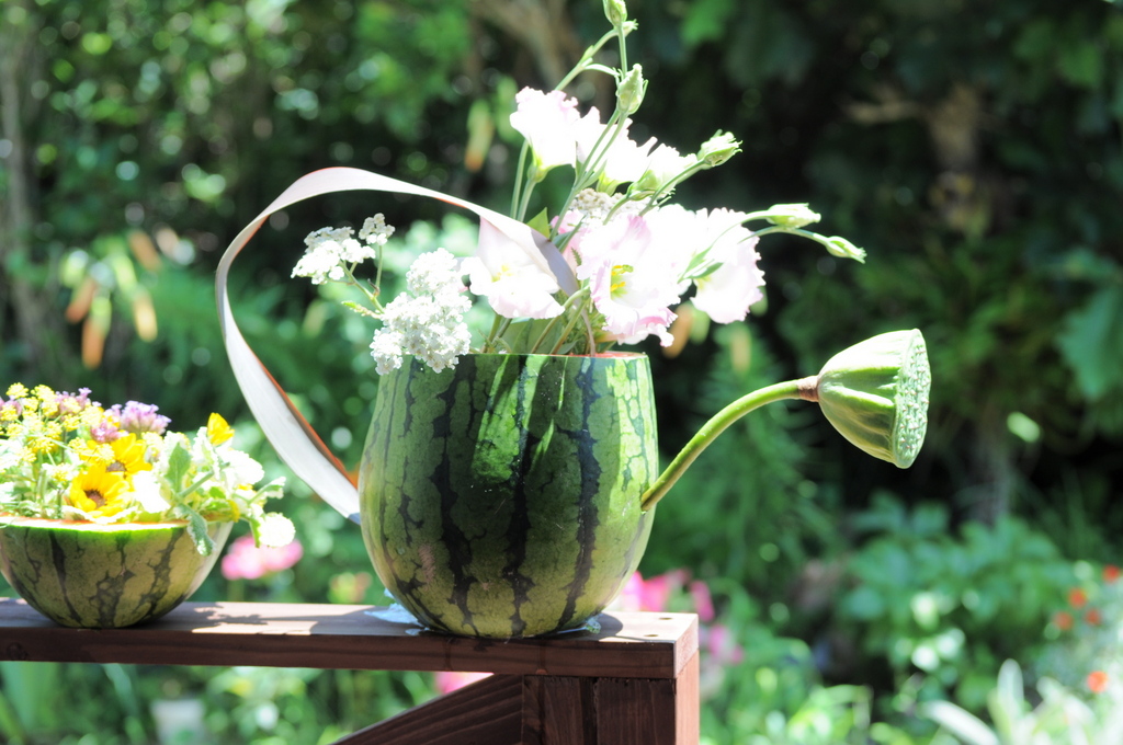 お上手!!じょうろに使わなかった部分にもちゃんとお花がアレンジしてあるんですね!スイカ、甘そうで、お花も喜んでそうですね!