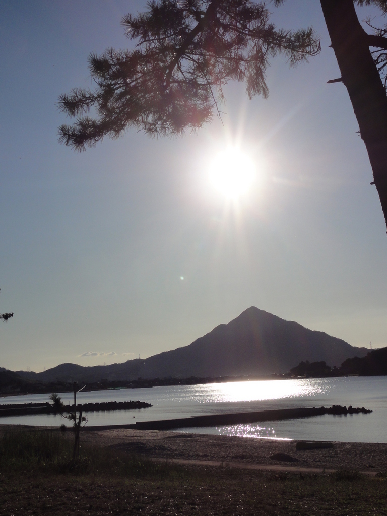 海を照らす眩しい太陽と・・そこに山が見えますね・私もずっとたたずみます♪♪