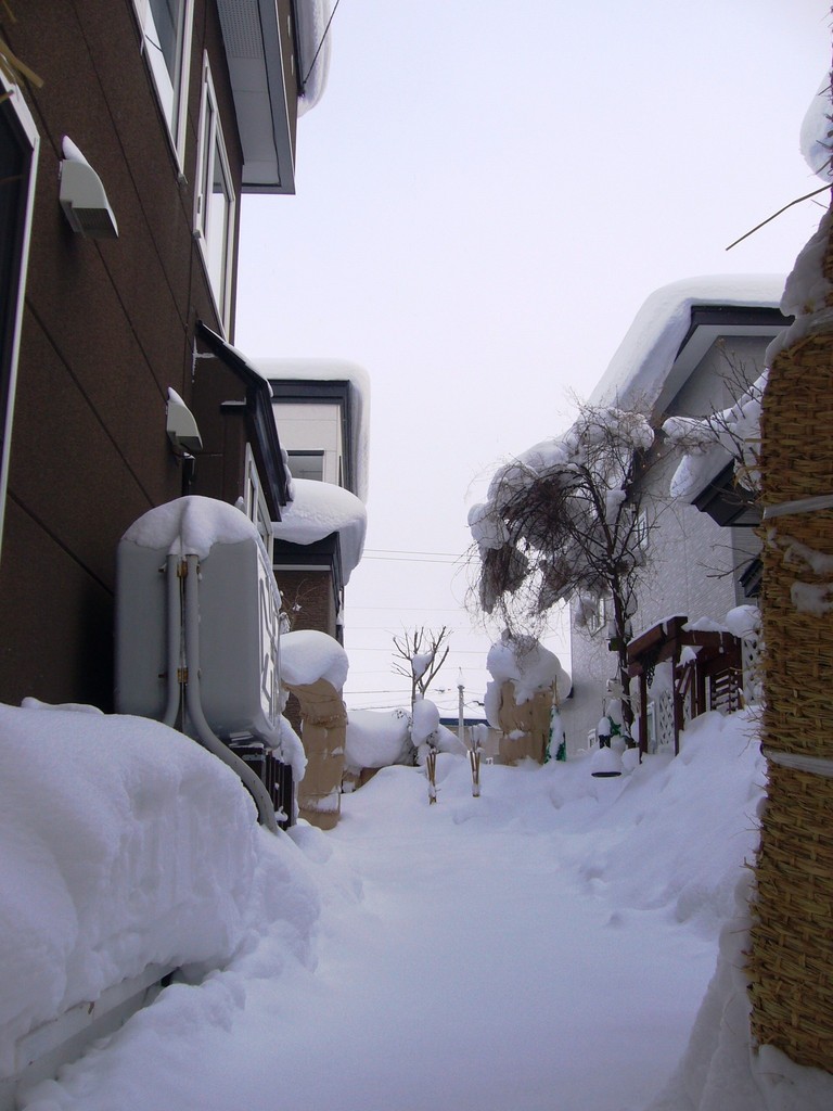 狭い小さな庭です。表の除雪した雪と降った雪と屋根の雪でこの場所はえらいことになります。