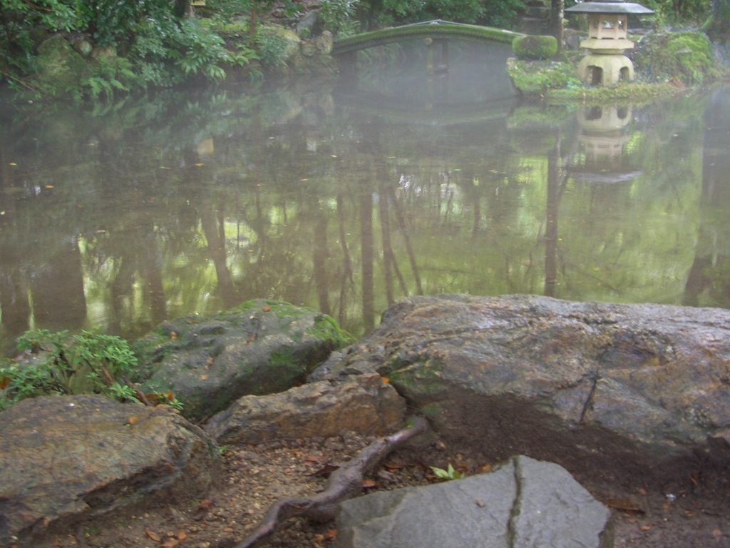 稲葉山の麓の岐阜公園の池ですね。水面にもやがかかって涼しそうです。小学生の頃よく板垣退助の像を見に行きました、