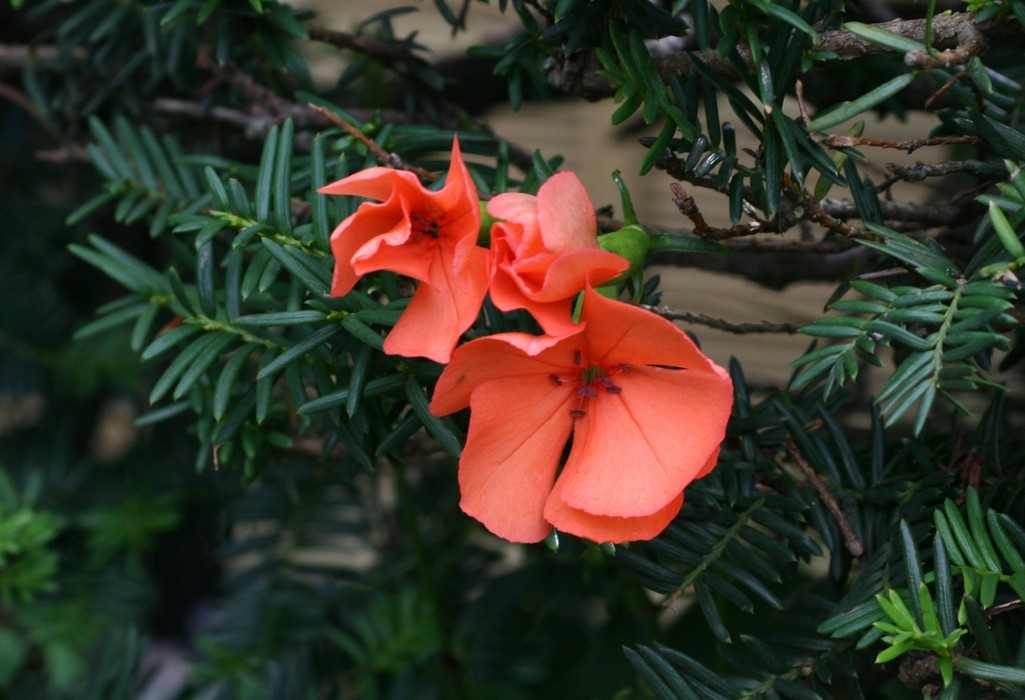 よそのお宅のイチイの生垣の間から顔を出していたのは、やっと開き始めたフシグロセンノウの花でした。秋はどんどん近づいてきています。