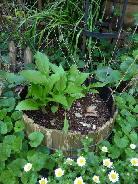 を廃品利用してみました。嫁さんの実家、三重:松阪のあこばあちゃんがむっちゃ美味しい菜漬けを作ってくれていた乳酸菌の染み込んだ樽を、バナーで焦してホスタのポットにしてみました。身近にあるものを、庭に利用するのがスキですねんっ♪♪