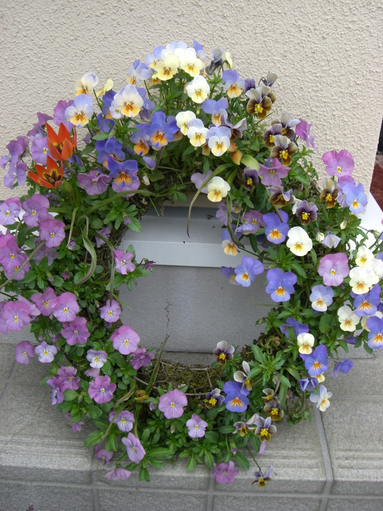 ビオラのリース♪かわいいですね(^-^)オレンジ色のお花はなんですか?