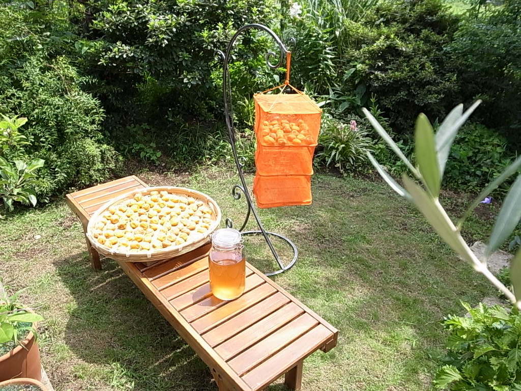 ザルに干しきれなかったので、ハンギング干しに挑戦してみました。梅酢はもっと透明かと思ってたんだけど・・大丈夫かな。