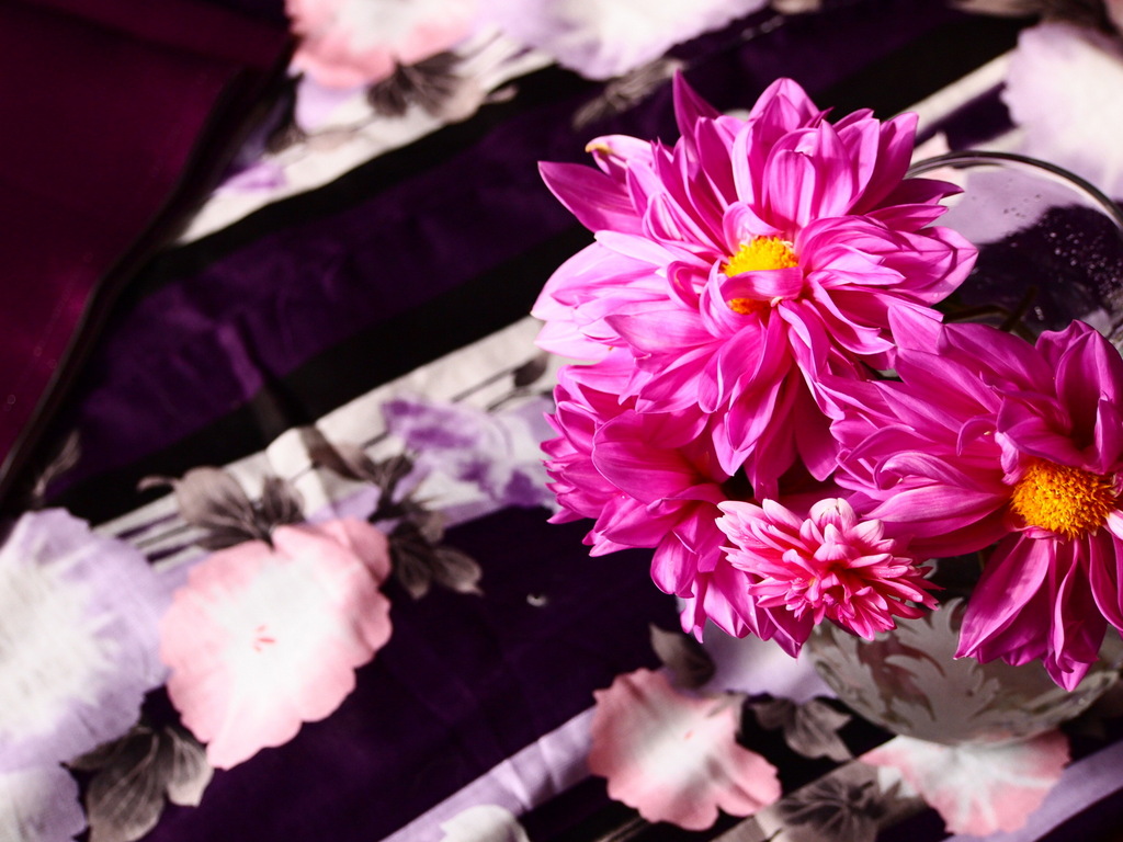 素敵なコラボですね!浴衣の柄も粋で、ダリアも一層、華やかにみえますね!