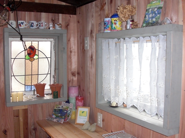 素敵な物置ですね!!ステンドグラスやレースのカーテン、可愛くて、私も真似したいです!