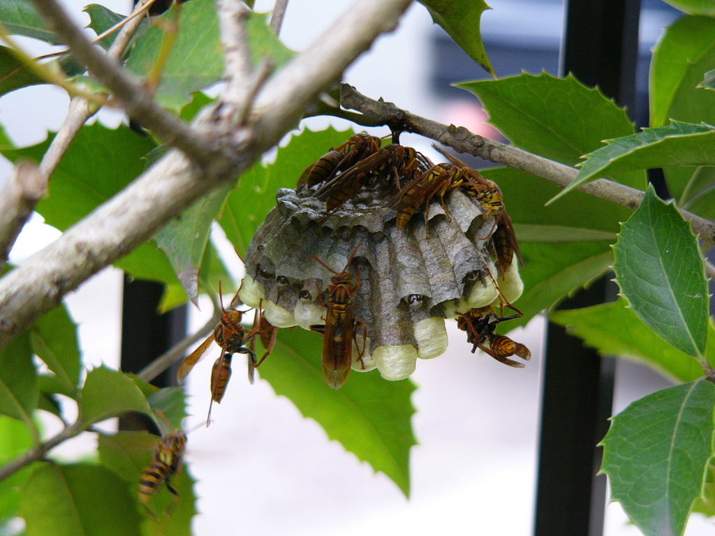 ヒイラギの枝にアシナガバチの巣がありました。働き蜂たちが忙しそうにしています。
