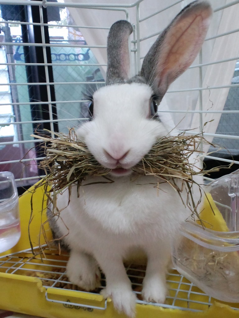 うさぎ~!! 本当にかわいいですね。抱きしめたくなります。うさぎ、私も大好きです。 あの絞り模様の花は、バラです。 切バラを頂いたので花瓶に挿しています。 インパクトあるバラですよね!