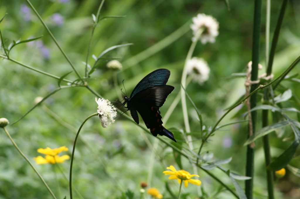 白のスカビオサ?にカラスアゲハ、いいですね。