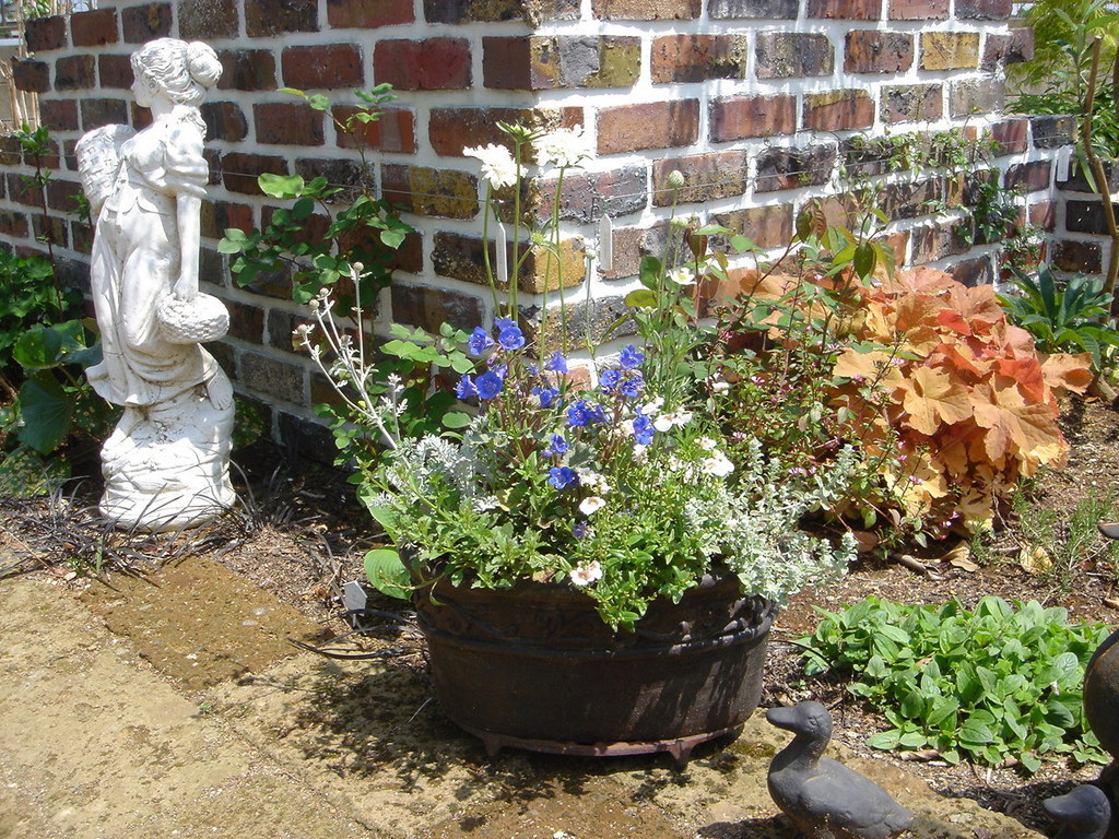 寄せ植えを庭の一角に置いてみました。