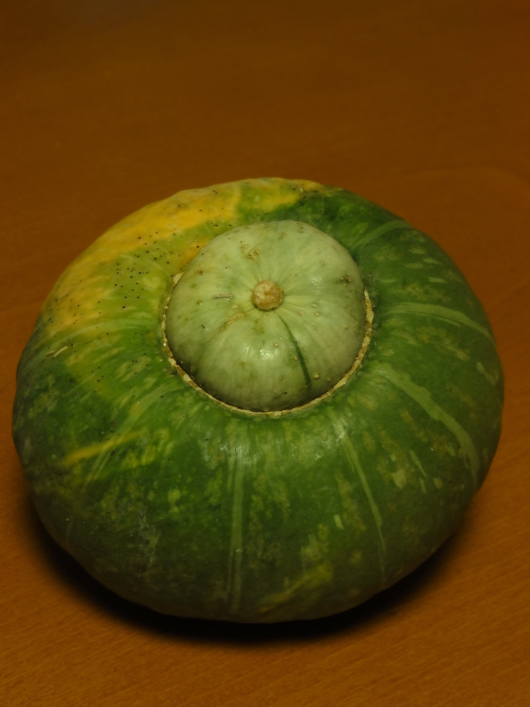 アニメキャラの頭みたいです。不思議ですねぇ~! ちゃんと両方かぼちゃということは、この大きなかぼちゃは小さいカボチャを飲み込んじゃったのかナ!? コレを見たお嬢さんは喜んだでしょうね~^^