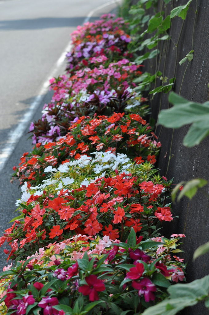たくさん咲いていて見事ですね! ニューギニアインパチェンス=サンパチェンスですか???暑さに強く、大気汚染物質も吸着してくれるそうですからこれだけあったら道沿いの空気はクリーンですね!