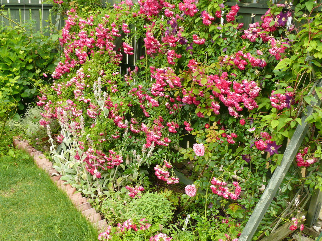 塀にもエクセルサを誘引して紫のクレマチス等と合わせております。