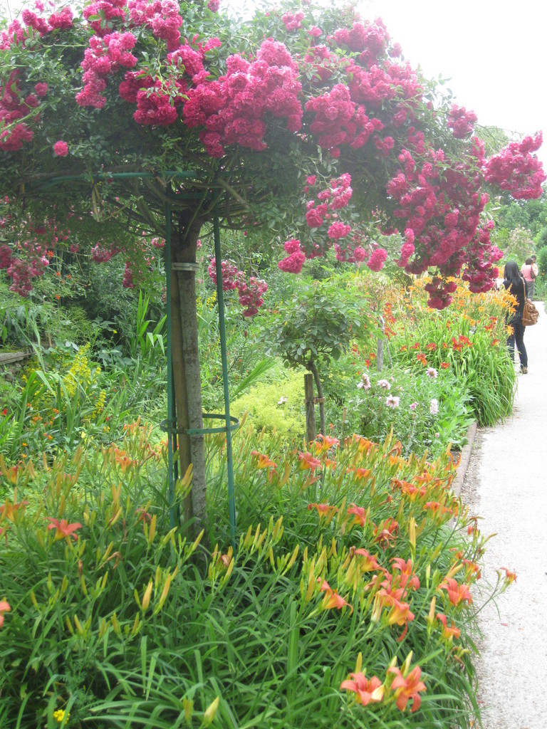 daさん、おっしゃられる通り、ヘメロカリスの上に咲いている濃いピンク色のスタンダード仕立てのバラは「マリ・ヴィオ」です。