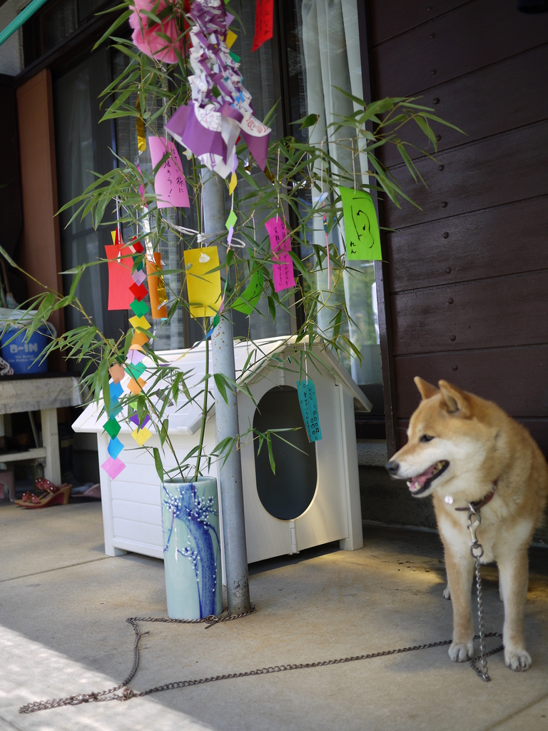 短冊に書かれたお願いは(笑顔)ワンちゃん真剣な顔してますね♪
