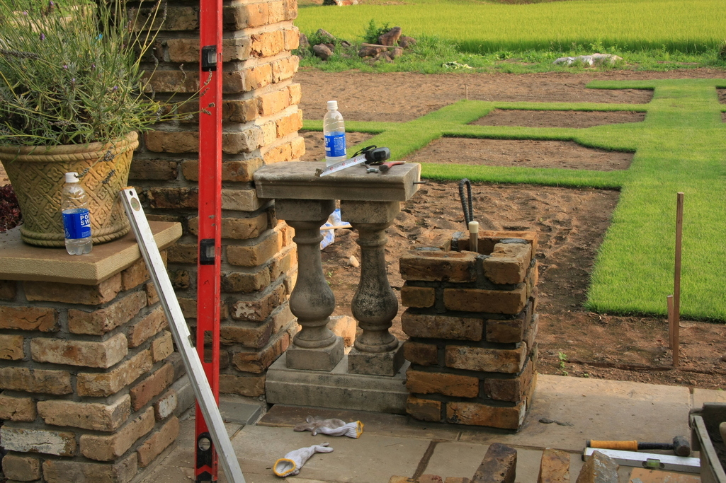 小柱をレンガを積み上げ制作、積み上げたら最後にコンクリートを中に流し込み固める。
