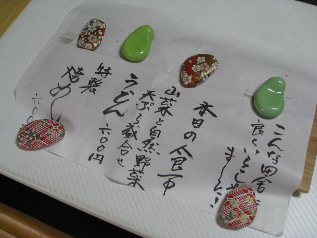 手書きのメニュー、お客さんのことを考えて・・・いいですねぇ!「山菜と自然野菜天ぷら盛り合わせ」ってすっごくおいしそう^^