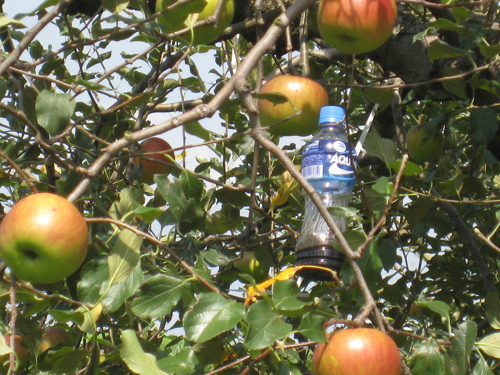 ペットボトルはスズメバチ対策だと思います。上部に穴をあけて中にジュースや酢、酒などのカクテルを少量入れるとスズメバチが匂いでどんどん入ります。実は私も時々ぶら下げるんですよ。スズメバチやヘビとはお友達になりたくないです~
