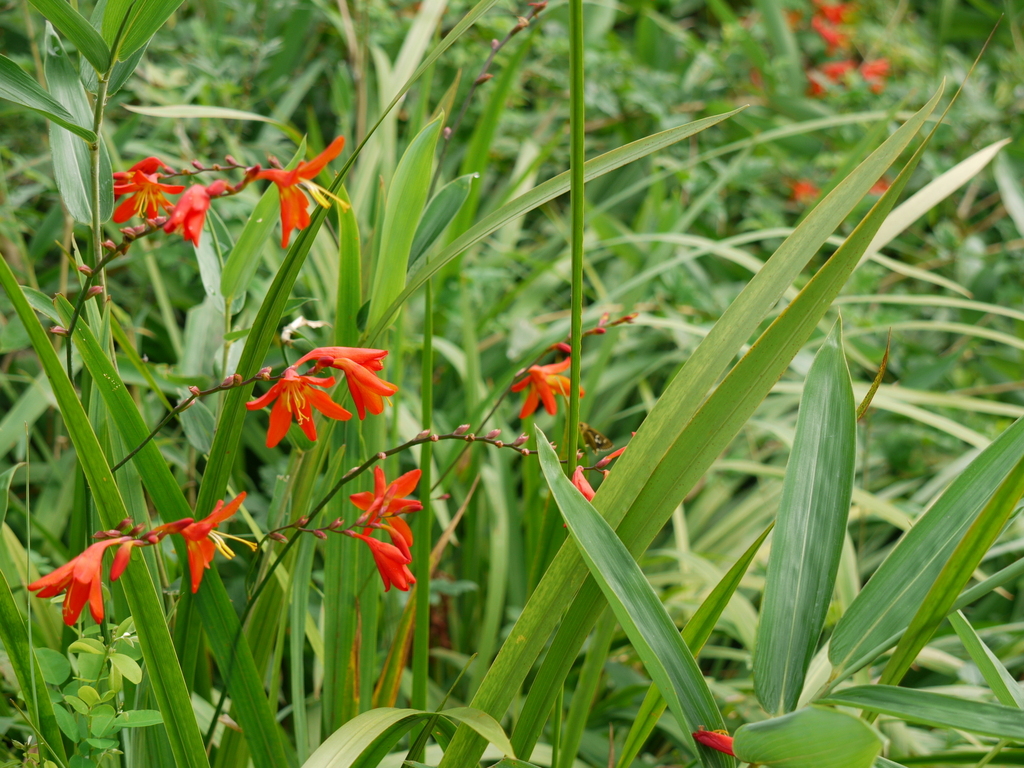 私のクロコスミアも一緒です。勝手に生えてきて、どんどん増えて・・・ちょっと困りものです^^; 花はきれいなんですけど、生命力強すぎで、他のお花がぁ~TT