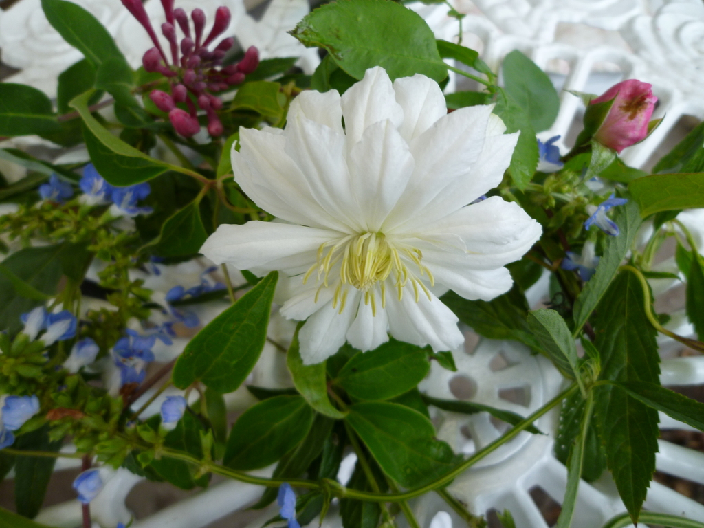 真っ白なクレマチスを中心にブルーのセージ、赤いハニーサックルの蕾を添えて素適な一枚になっています。