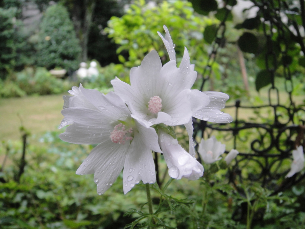 純白の花びらに淡いピンクの花芯、雨に濡れてとても素適。