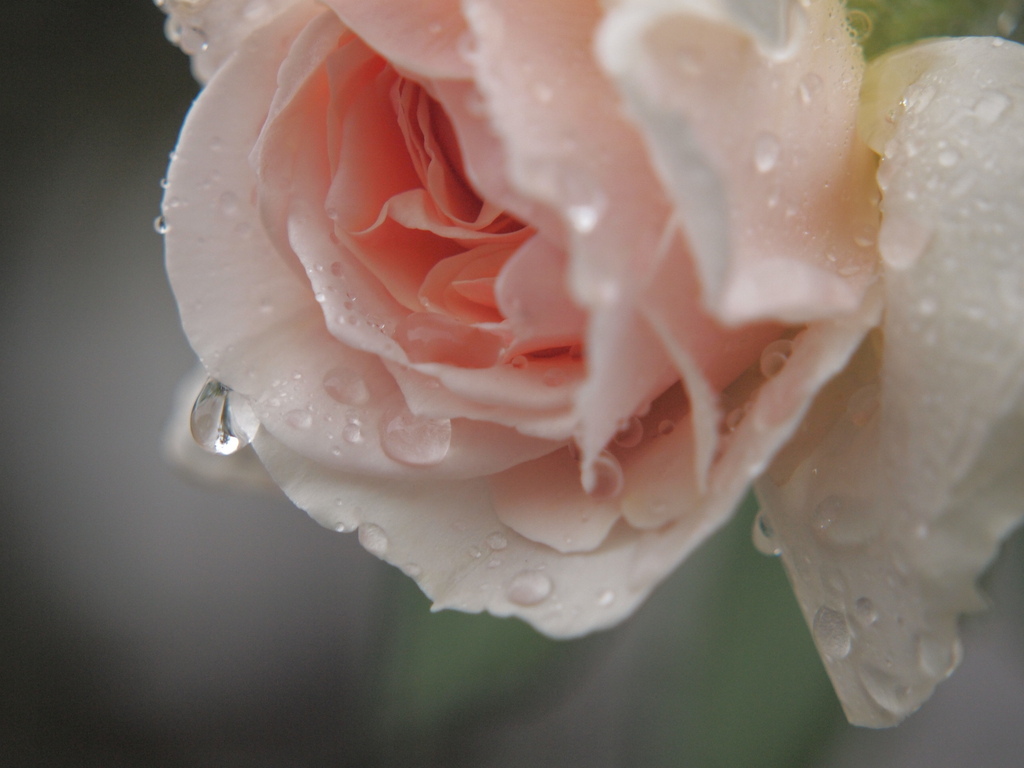 やさしいサーモンピンク色の花びらにつく雨のしずく・・・ロマンティックですね。