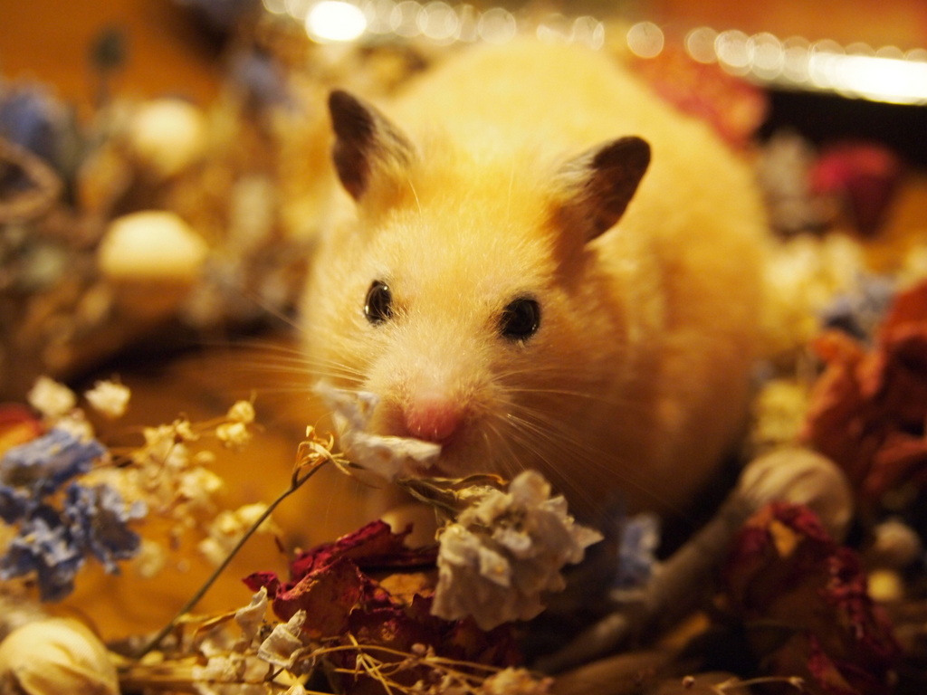 ムーチャンかわいい~。耳だけ色が付いているのですか?リースがお食事なんて、セレブなハムスターですね。