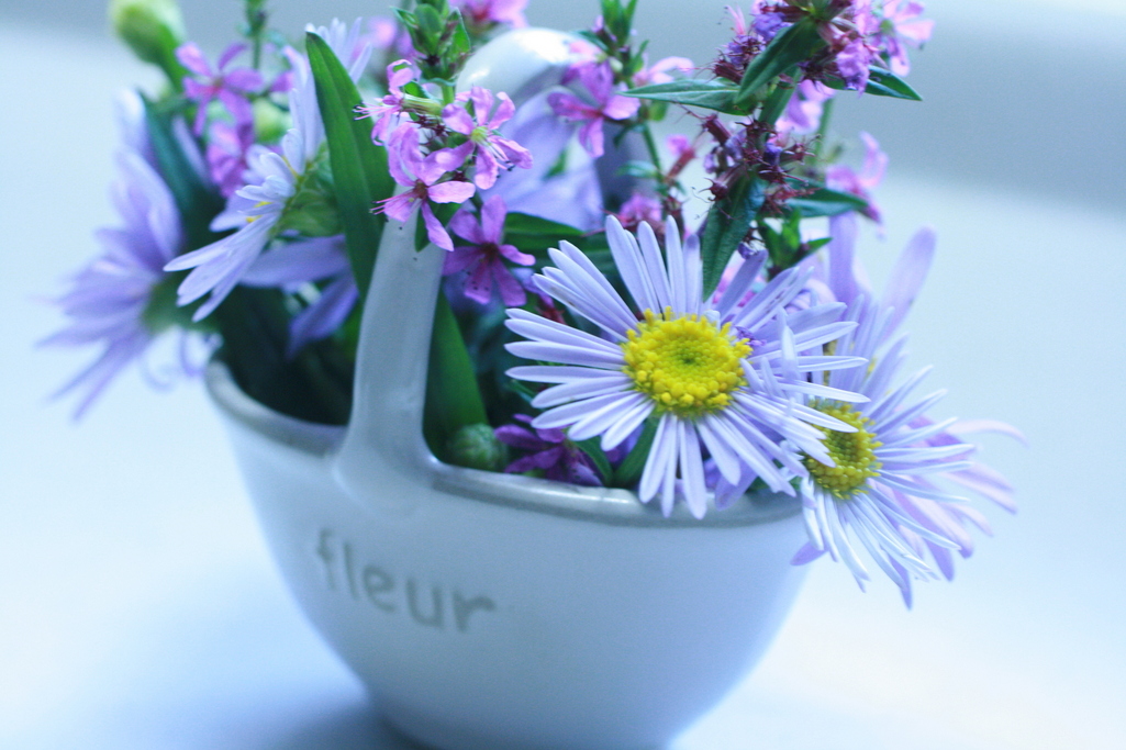 可愛い小花を飾ると、台所に立つのが楽しくなりますね。器にフルールって書いてあって・・・オシャレ~(*^^*)
