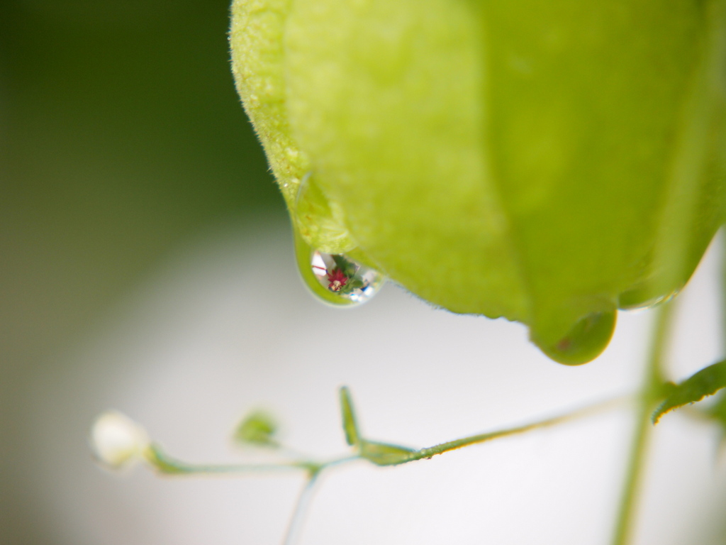 風船カズラの雫に真っ赤なクレマチス?がきれいに写っていますね。