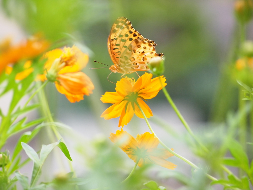 綺麗な色の蝶ですね!オレンジのコスモスとオレンジの蝶のコラボ・・・偶然舞い降りてきたって・・・興奮しちゃいますね!