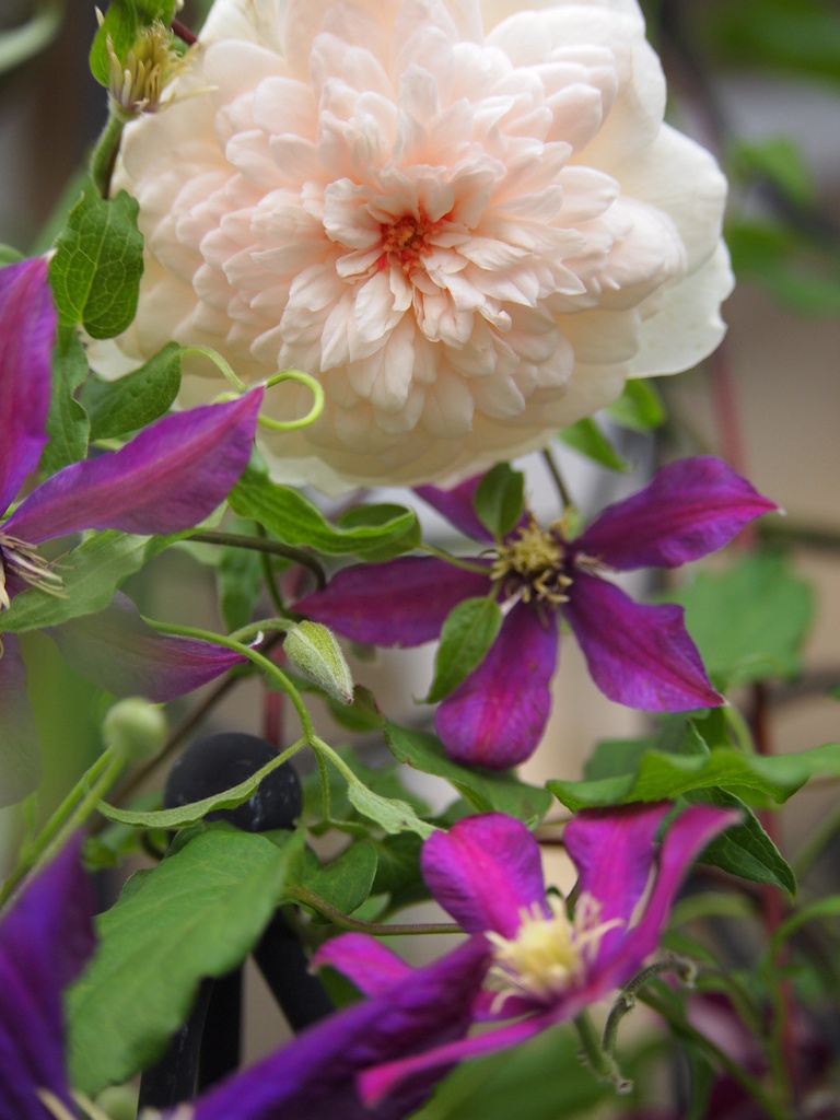 ふんわりと柔らかそうな花びらと中心部の紅がなんともいえないかわいいバラですね。それをクレマチスが引き立てています。