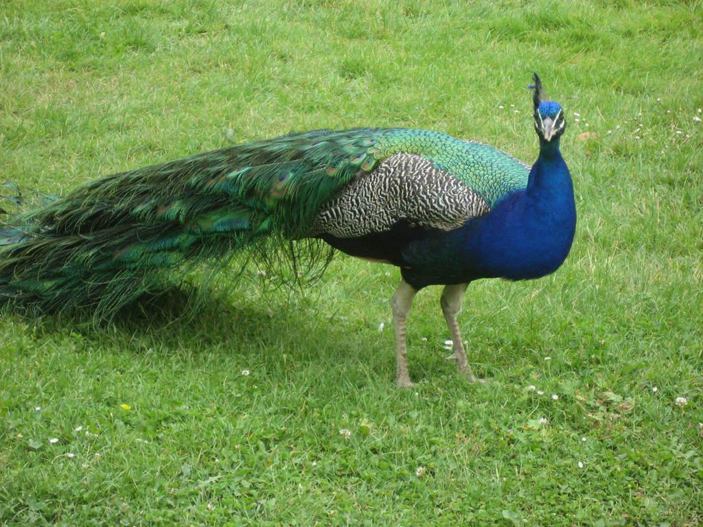 きれいな孔雀ですね。孔雀はあんまり遠く飛ばないので、結構放し飼いでも大丈夫みたいですね。でもほとんど尾羽がボロボロのが多いですが、これはきれいですね。