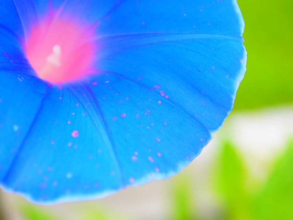中心部のピンクと周りの緑のボケが青い花びらと見事にコラボしています。