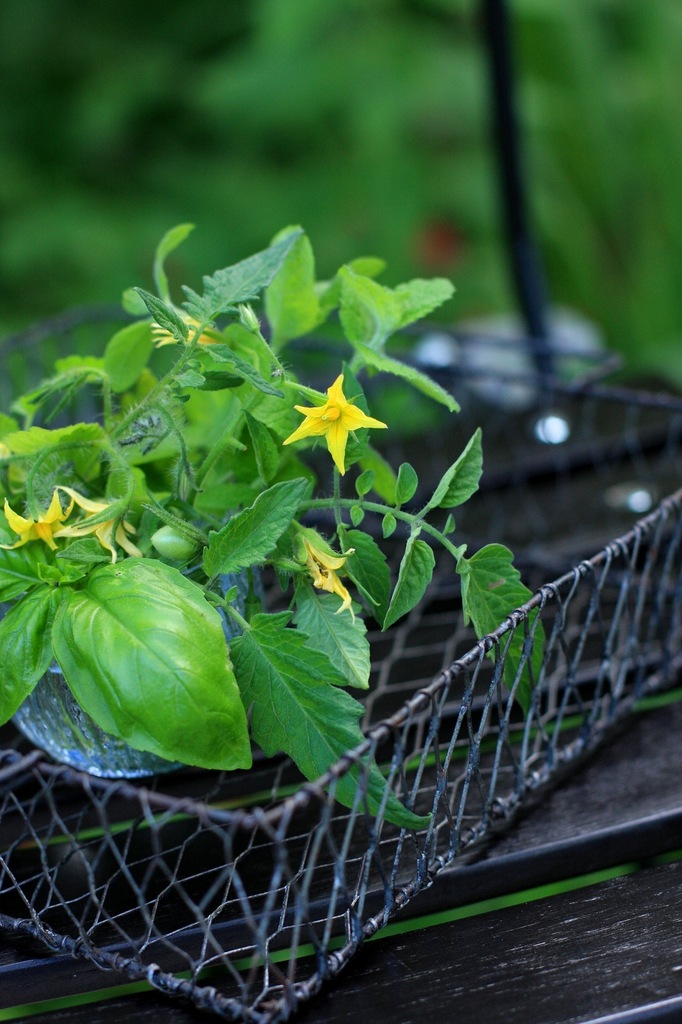 野菜の花を飾ってみるのもいいですね。アイアンのカゴがオシャレ~^^! 私も、トマトはもったいなくて切れない派です^^; でも、両方とも近づくだけでいい香りがして、キッチンに飾るのにぴったりかも~(*^^*)