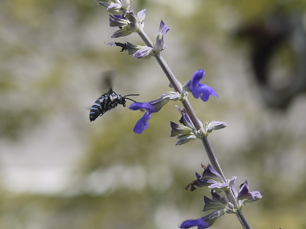 ホバリングしている青い蜂とキャットミント(?)の花にピントがビシャリ合っていて凄い写真ですね。