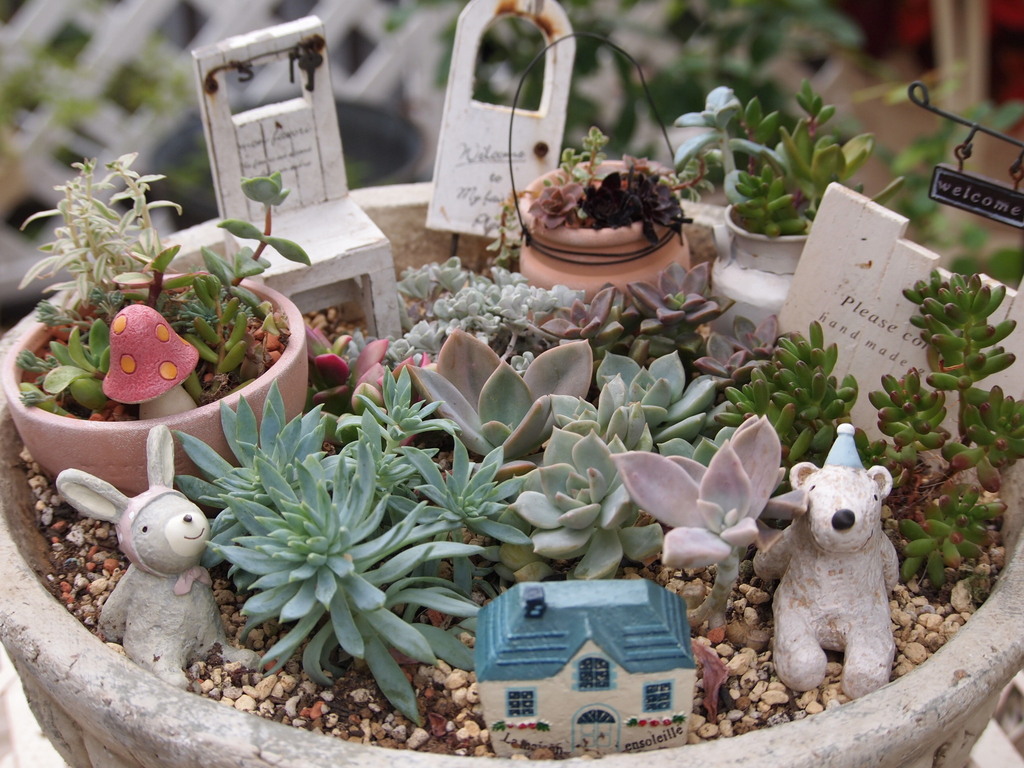 多肉の森に可愛い動物たち、とてもキュートな寄せ植えですね^^! 多肉は半年ほどですぐにビヨーンってのびてしまって、しょっちゅう植え変えなければならないのがめんどくさくて、どうも敬遠ぎみなんですが、こんな可愛い寄せ植えを見たら、もう一度チャレンジしようかなって思っちゃいます。ステキです(*^^*)