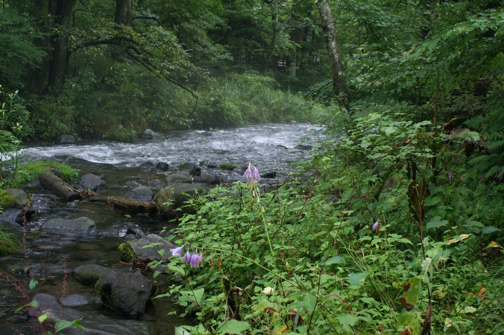 川岸には野生のギボウシの花やミズヒキの花が咲いていました。