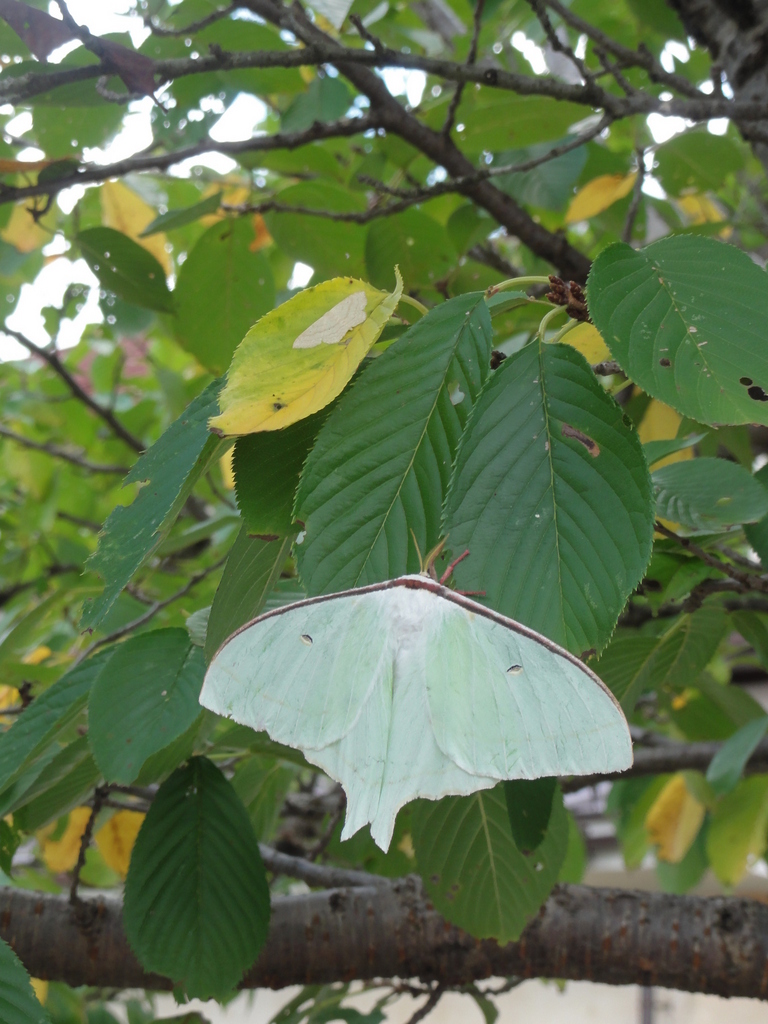 うちにもいたことがあります!オオミズアオ!うちのは、もっとぶら下がっていたのですよ^^ブログに載せたら、この蛾が一番好きと言う人がコメントくれました。幼虫も宝石のようらしいです^^その時のブログです。http://blogs.yahoo.co.jp/sukothupu222/folde