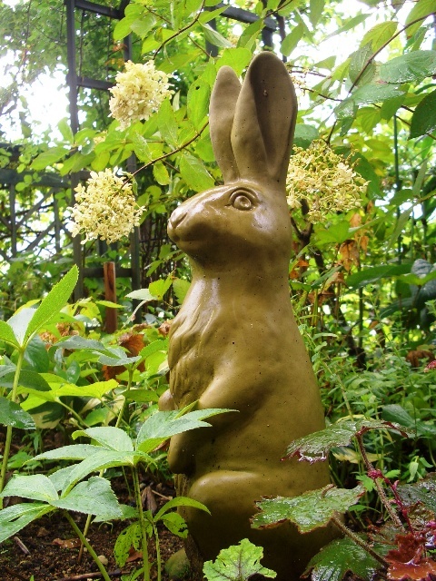 可愛い置物がたくさんあるんですネ。このうさぎちゃんもカワイイ♡ ピラミッドアジサイがお似合いです^^