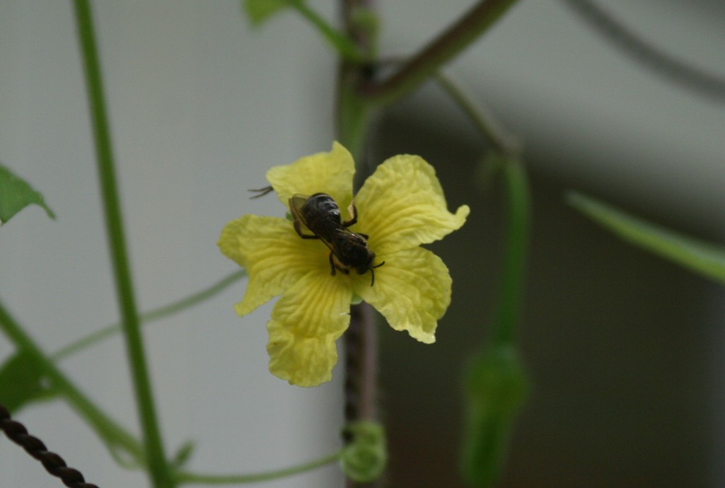 グリーンカーテンにゴーヤとアサガオを交互に植えているのですが、ゴーヤの花は咲いていても一向に実がなる気配がありません。でも今朝は蜂がやってきて飛び回っていたので実がなるのではないかと楽しみにしています。