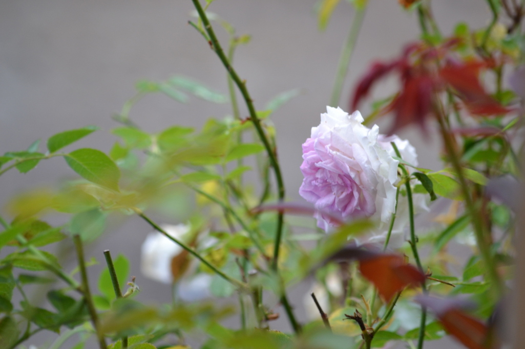 手前の新芽?の赤みと曇り空が薔薇の色あいを引き立てていますね(^-^)