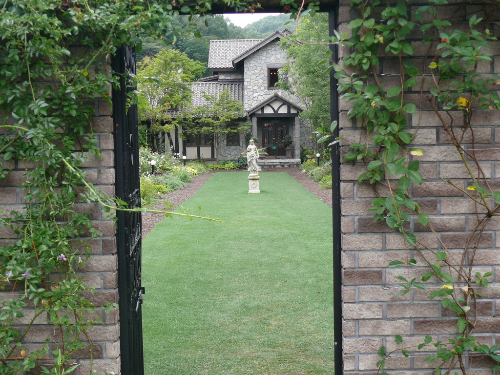 入り口の噴水から右を向くとホテルに向かうボ-ダ-ガ-デンがあります、石壁が印象的です。