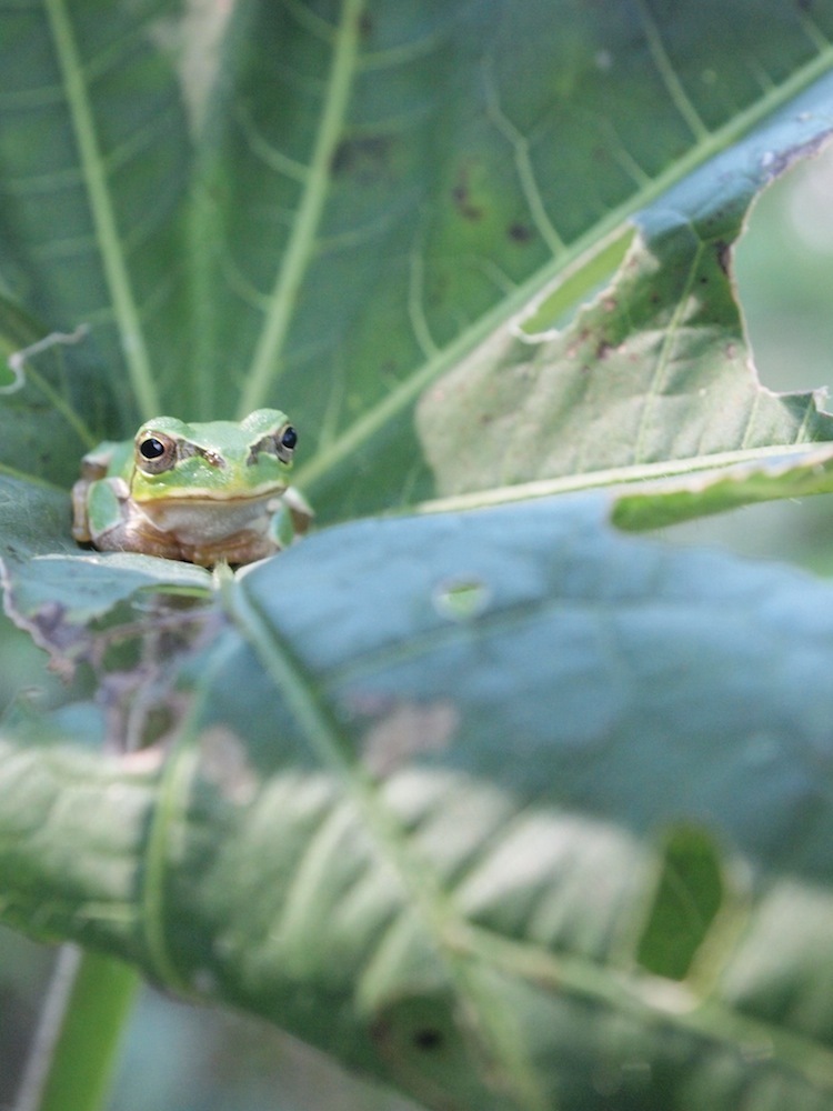 カエル、好きです♡ 葉っぱの真ん中にしっかりおさまって、ナイスショットですね~(*^^*) 可愛い♡