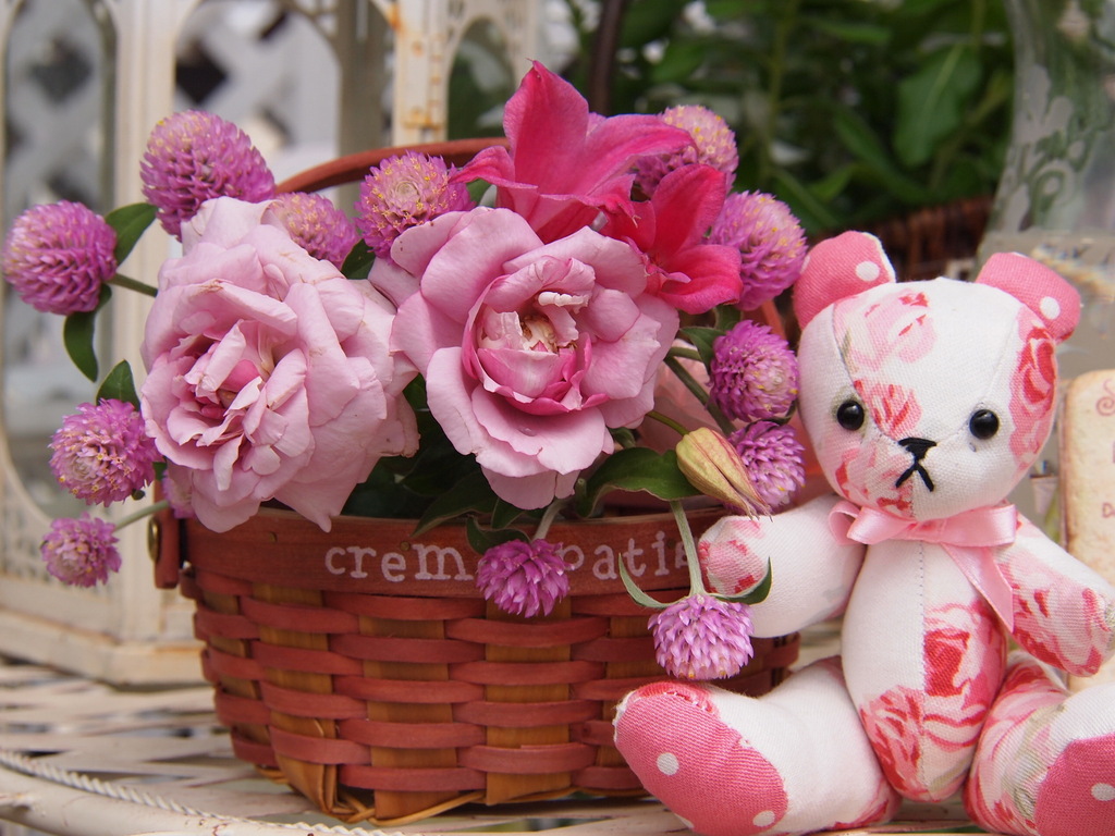 お花もクマちゃんもおそろいピンクですね。(間違ってたら申し訳ないけど)もしやピンクのクマちゃんはローラアシュレイのですか?プレゼントに買おうかどうしようかお店で迷った記憶が.....