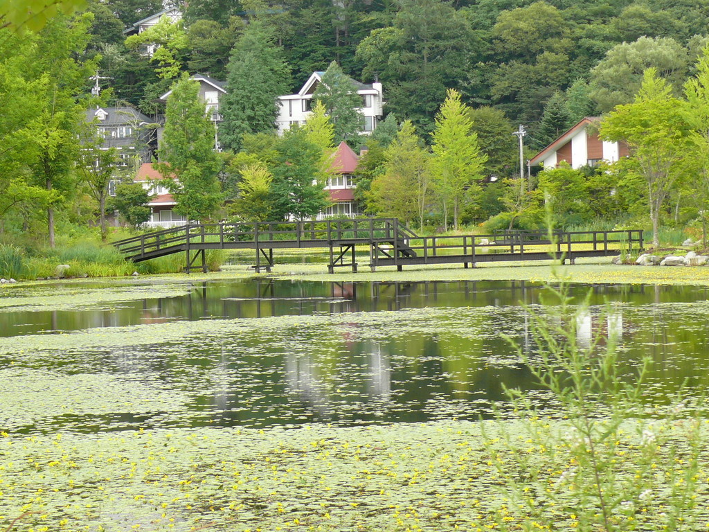 池の水面には軽井沢らしい別荘が写りバランス良い水草に可愛い黄色の花が咲き乱れ別世界に感じました。