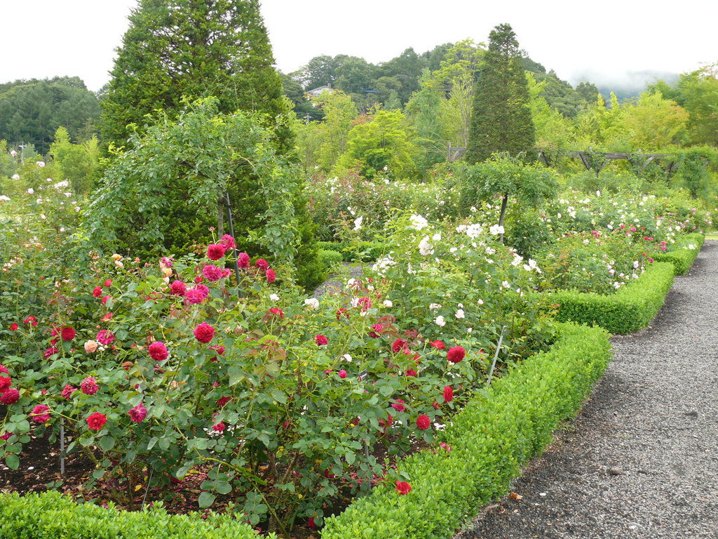 確かオープンしてまだ4年ほどですが、若手の大野耕生さんの監修でORやERを中心にしたガーデンとして開園したレイクガーデン。バブル絶頂期にはレマン湖としてリゾート地でしたがその後はゴーストタウンになっていました。まだまだ回りには廃墟となってホテルなども放置されていますが、このガーデンのおかげで軽井沢の名所として復活しています。