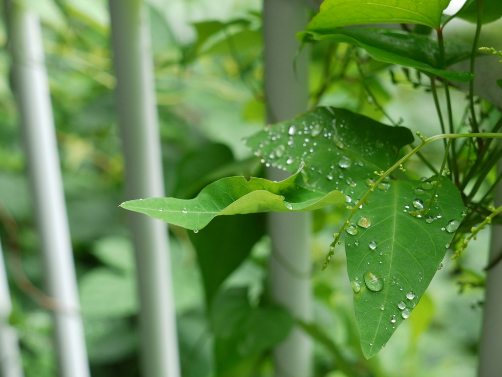 早朝の遊歩道で…。この後直に、冷風が、一気に露を吹き落としてしまいました。