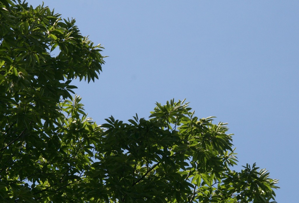 庭の栗の木越しに秋の空を撮りました。栗の実がぽつぽつ見えますよ。