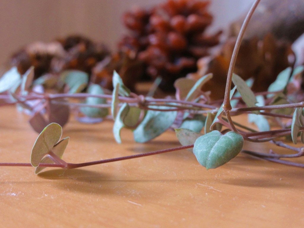 可愛い♡ 奥に置いたまつぼっくりや木の枝がとてもいい感じにハートかずらを引き立てていますね^^