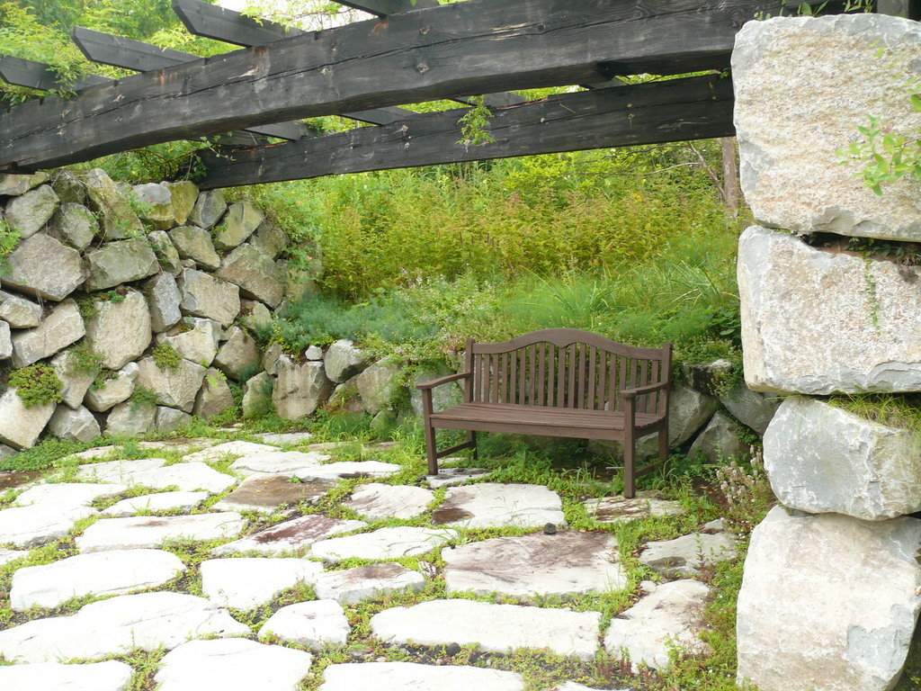 石垣と石垣の間を利用したパーゴラー風のベンチサイト。ホームガーデンとは違ってスケールが大きいですね。(^_^;)石畳もすばらしいです。
